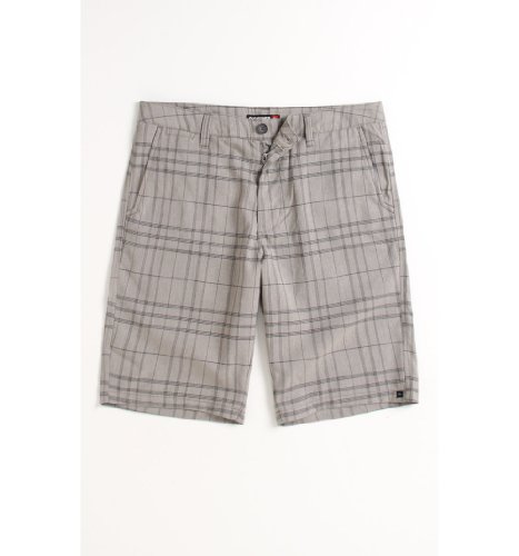 Online Exclusive! Allover two tone plaid chino shorts. Stretch material. Quiksilver logo on knee. Slant front pockets, back pocket with button closure. Button waist, zip fly.